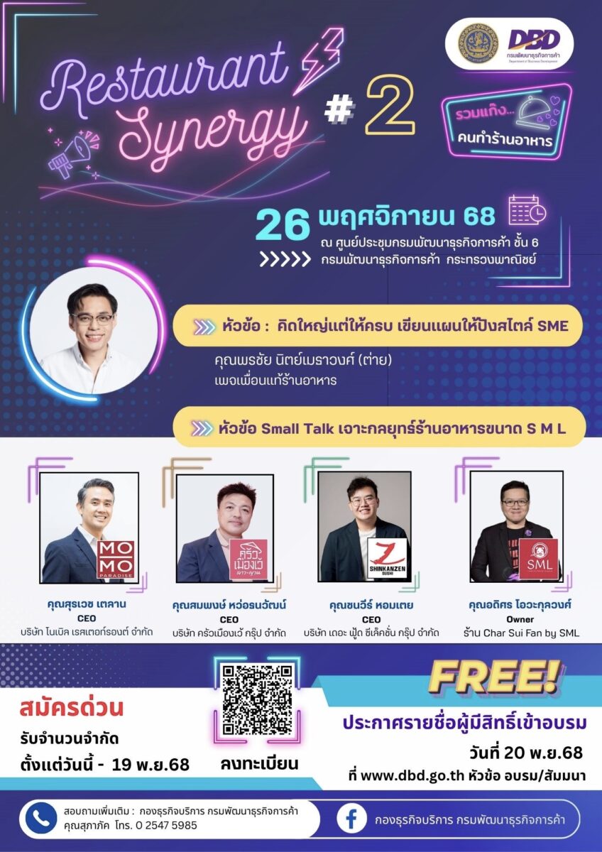 กรมพัฒนาธุรกิจการค้า กระทรวงพาณิชย์ เชิญชวนผู้ประกอบการร้านอาหารทั่วประเทศเข้าร่วมอบรมหลักสูตร Restaurant Synergy รุ่นที่ 2 รวมแก๊งคนทำร้านอาหาร หลักสูตรเข้มข้นที่รวบรวมความรู้ด้านการบริหารจัดการร้าน การตลาดดิจิทัล