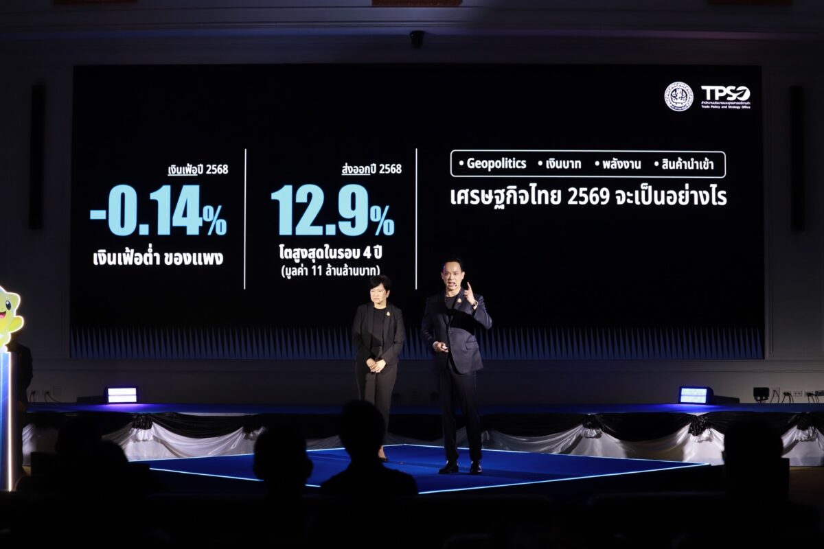การเสวนาในครั้งนี้ สนค. ได้นำเสนอการวิเคราะห์เศรษฐกิจไทยปี 2569 ผ่านการเชื่อมโยงภาพเศรษฐกิจมหภาค การค้าในประเทศและต่างประเทศ รวมถึงปัจจัยเสี่ยงสำคัญที่กำลังกระทบเศรษฐกิจไทย อาทิ สถานการณ์ภูมิรัฐศาสตร์ ค่าเงินบาท ราคาพลังงาน และการแข่งขันจากสินค้านำเข้า เพื่อสะท้อนให้เห็นว่าโครงสร้างเศรษฐกิจไทยในปัจจุบันยังขาดการเชื่อมโยงอย่างเป็นระบบ โดยเฉพาะระหว่างราคา รายได้ และโอกาสทางเศรษฐกิจของประชาชน