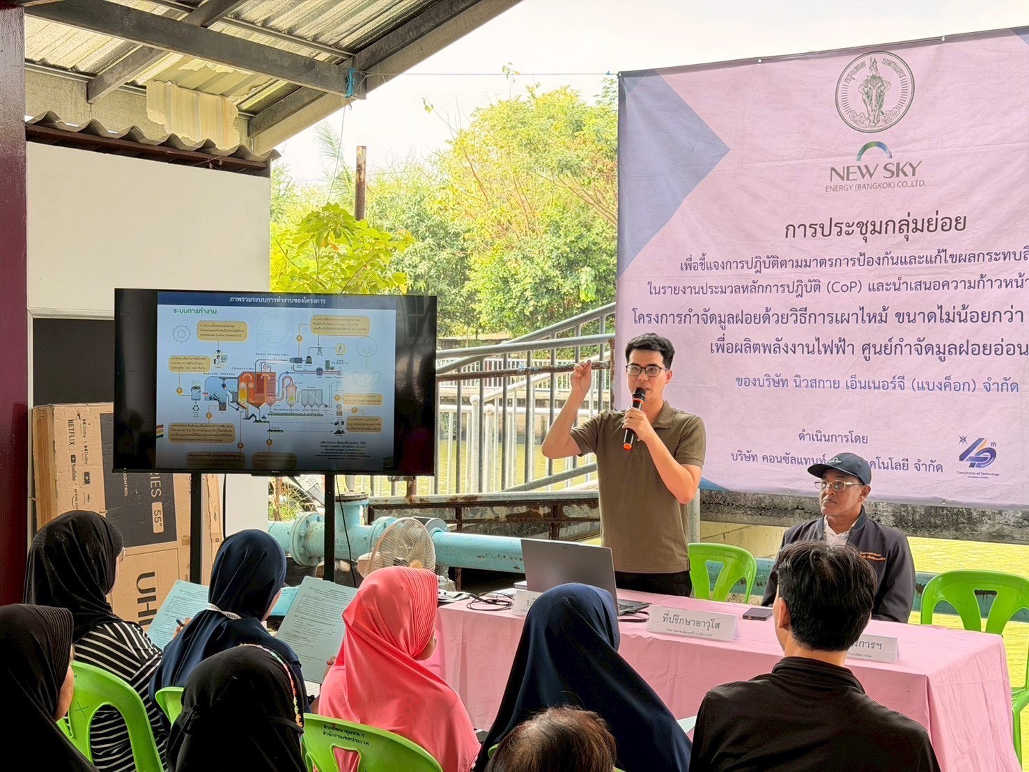 นายนพดล พฤกษะวัน ประธานเจ้าหน้าที่บริหาร บริษัท นิวสกาย เอ็นนอร์จี (แบงค็อก) จำกัด กล่าวว่า บริษัทให้ความสำคัญกับการสื่อสารและการมีส่วนร่วมของประชาชนในพื้นที่โดยรอบโครงการอย่างต่อเนื่อง โดยทีมผู้บริหารและผู้เชี่ยวชาญของโครงการ ได้แก่ พล.ต.อ. ดร. ปัญญา มาเม่น และ นายวินัย สวัสดิ์มณี ที่ปรึกษาอาวุโสของโครงการ พร้อมด้วย นายเศรษฐพัส กมลศุภประยูร ผู้จัดการฝ่ายมวลชนสัมพันธ์ และทีมงาน ได้ลงพื้นที่จัดประชุมกลุ่มย่อยรับฟังความคิดเห็นของประชาชนรวม 22 ครั้ง ระหว่างวันที่ 19 กุมภาพันธ์ – 1 มีนาคม 2569 มีผู้เข้าร่วมกว่า 1,517 คน