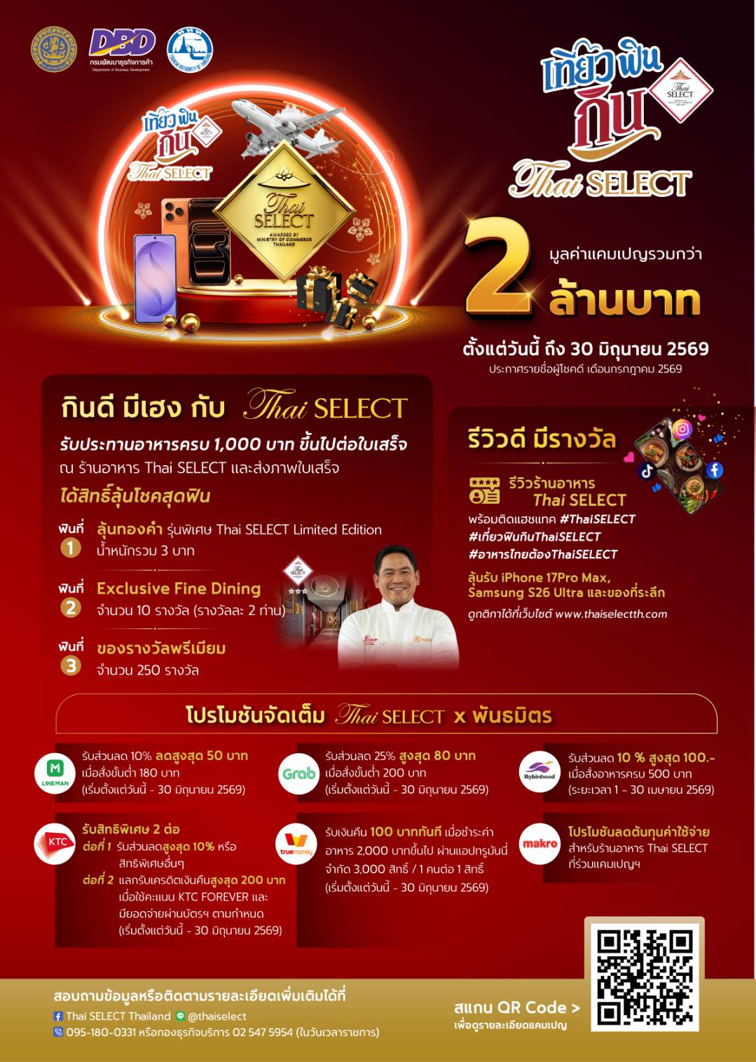 อธิบดีพูนพงษ์ กล่าวต่อว่า “ นอกจากนี้ ยังมีกิจกรรม ‘รีวิวดี มีรางวัล’ เอาใจสายรีวิวและครีเอเตอร์ให้ร่วมถ่ายทอดความประทับใจผ่านโซเชียลมีเดียเพื่อลุ้นรับรางวัลมูลค่ารวมกว่า 150,000 บาท กติกาง่ายๆ เพียงกดไลก์และแชร์กิจกรรมไปยัง Facebook หรือ TikTok ของตนเอง พร้อมเปิดเป็นสาธารณะ จากนั้นรีวิวร้านอาหารที่ได้รับตราสัญลักษณ์ Thai SELECT จะเป็นรูปแบบภาพหรือวิดีโอก็ได้ โพสต์ลงโซเชียลมีเดียพร้อมติดแฮชแท็ก #ThaiSELECT #เที่ยวฟินกินThaiSELECT #อาหารไทยต้องThaiSELECT และ #ชื่อร้านอาหาร (ที่ไปทานอาหาร) เพียงเท่านี้ก็มีสิทธิ์ลุ้นรับสมาร์ทโฟนรุ่นล่าสุด ได้แก่ *iPhone 17 Pro Max 1 เครื่อง *Samsung Galaxy S26 Ultra 1 เครื่อง และ *พัดลมมือถือ 100 รางวัล โดยร่วมสนุกได้ตั้งแต่ 15 พฤษภาคม 2569 – 30 มิถุนายน 2569 (ประกาศผล 15 กรกฎาคม 2569)”